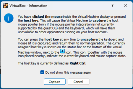 Click into the virtual machine console. VirtualBox displays notifications about the configured host key, which allows you to leave the console windows. The host key in this lab environment is configured as Alt. Choose Do not show this message again and click the Capture button.
