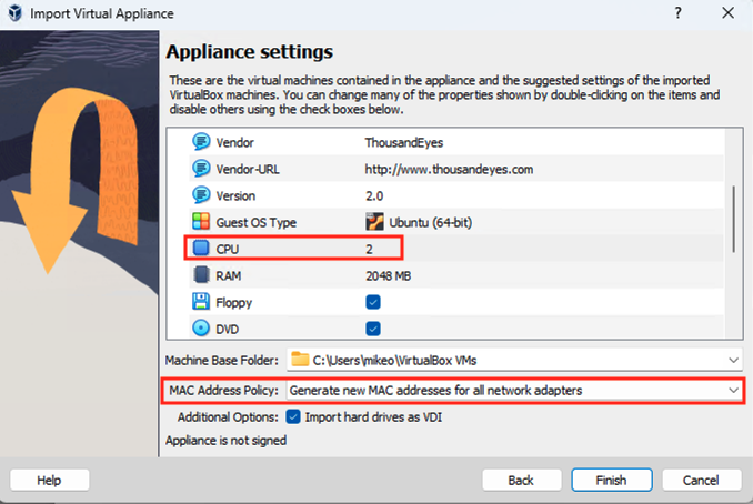 In the Appliance settings section, edit the CPU field and change it to 2. At the bottom, under MAC Address Policy, click Generate new MAC addresses for all network adapters.