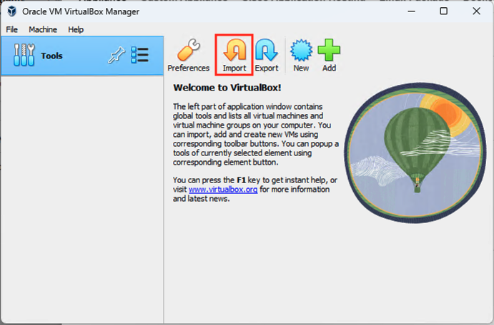 Click the Import button. Click the yellow folder icon on the right, navigate to the Downloads folder, and choose the downloaded OVA file. Click Open.